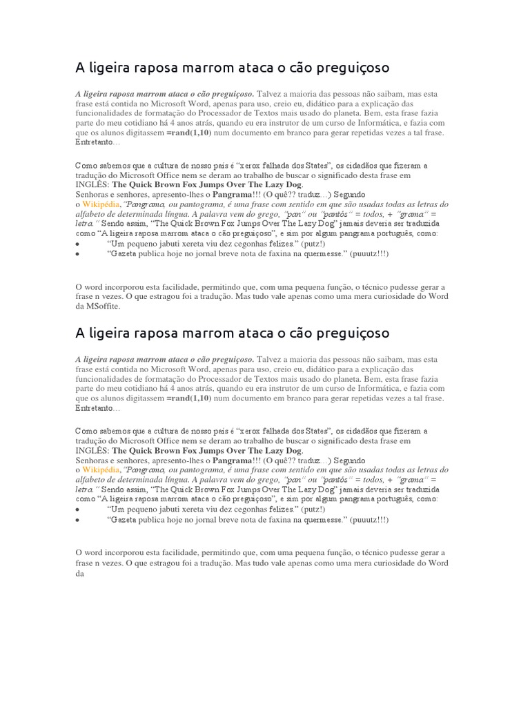 A ligeira raposa marrom ataca o cão preguiçoso. Talvez a maioria das pessoas não saibam, mas esta frase está contida no Microsoft Word, apenas para uso, creio eu, didático para a explicação das funcionalidades de formatação do Processador de Textos mais usado do planeta.