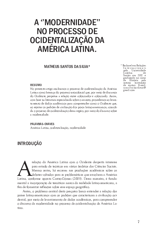 (PDF) A ‘’MODERNIDADE’’ NO PROCESSO DE OCIDENTALIZAÇÃO DA AMÉRICA LATINA Matheus Santos da