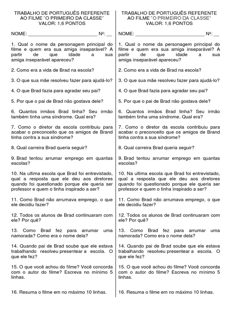 Atividade Sobre O Filme O Primeiro Da Classe Com Resposta EDUCA