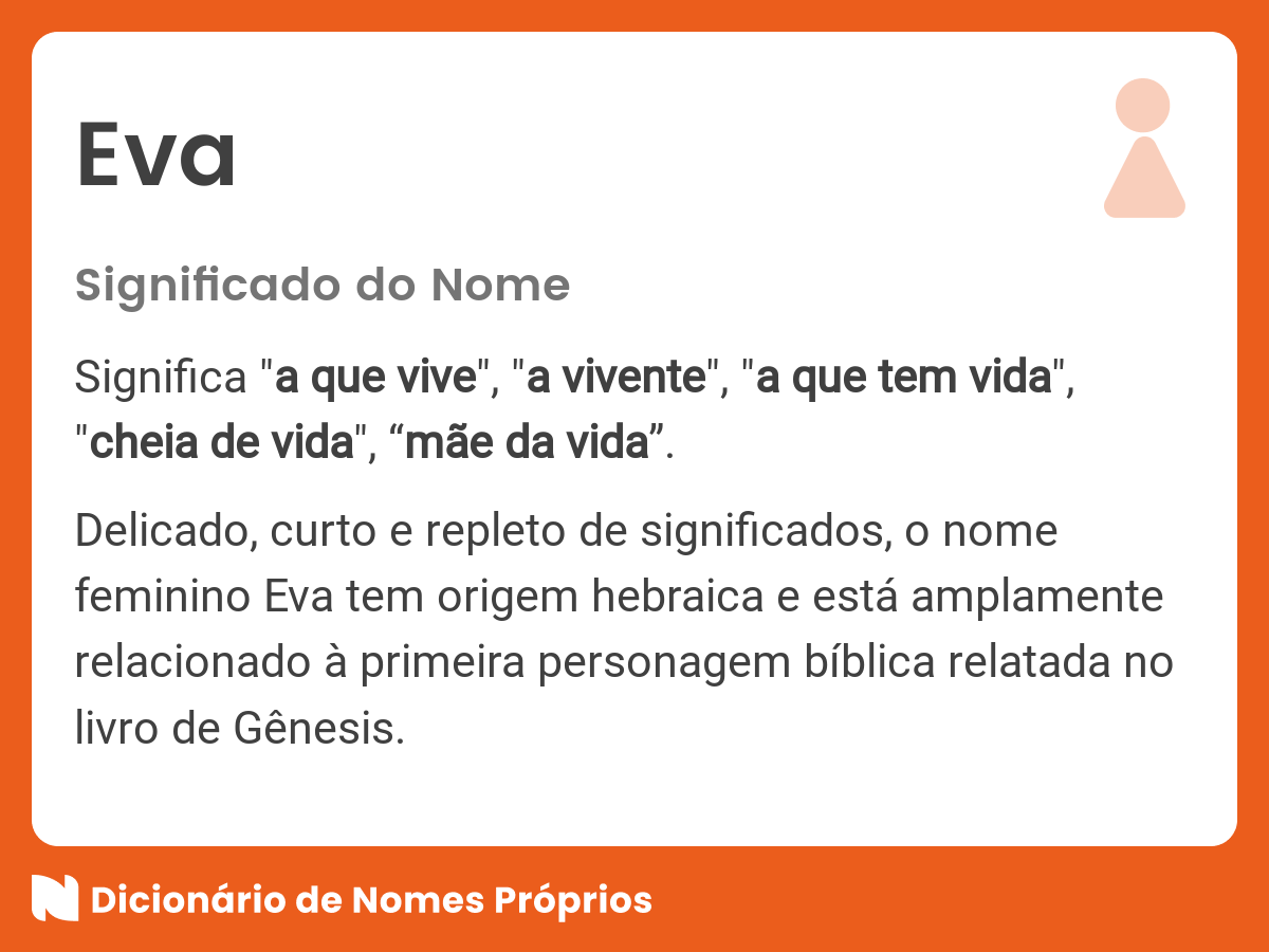 ️ A origem do nome Eva é Hebraica. Eva é o nome feminino de "havva", que significa "vida".. Qual o significado do nome "EVA"? A origem do nome Eva é Hebraica. Eva é o nome feminino de "havva", que significa "vida". Imagem para compartilhar no Stories e Status do Instagram e TikTok Clique para baixar essa Imagem.