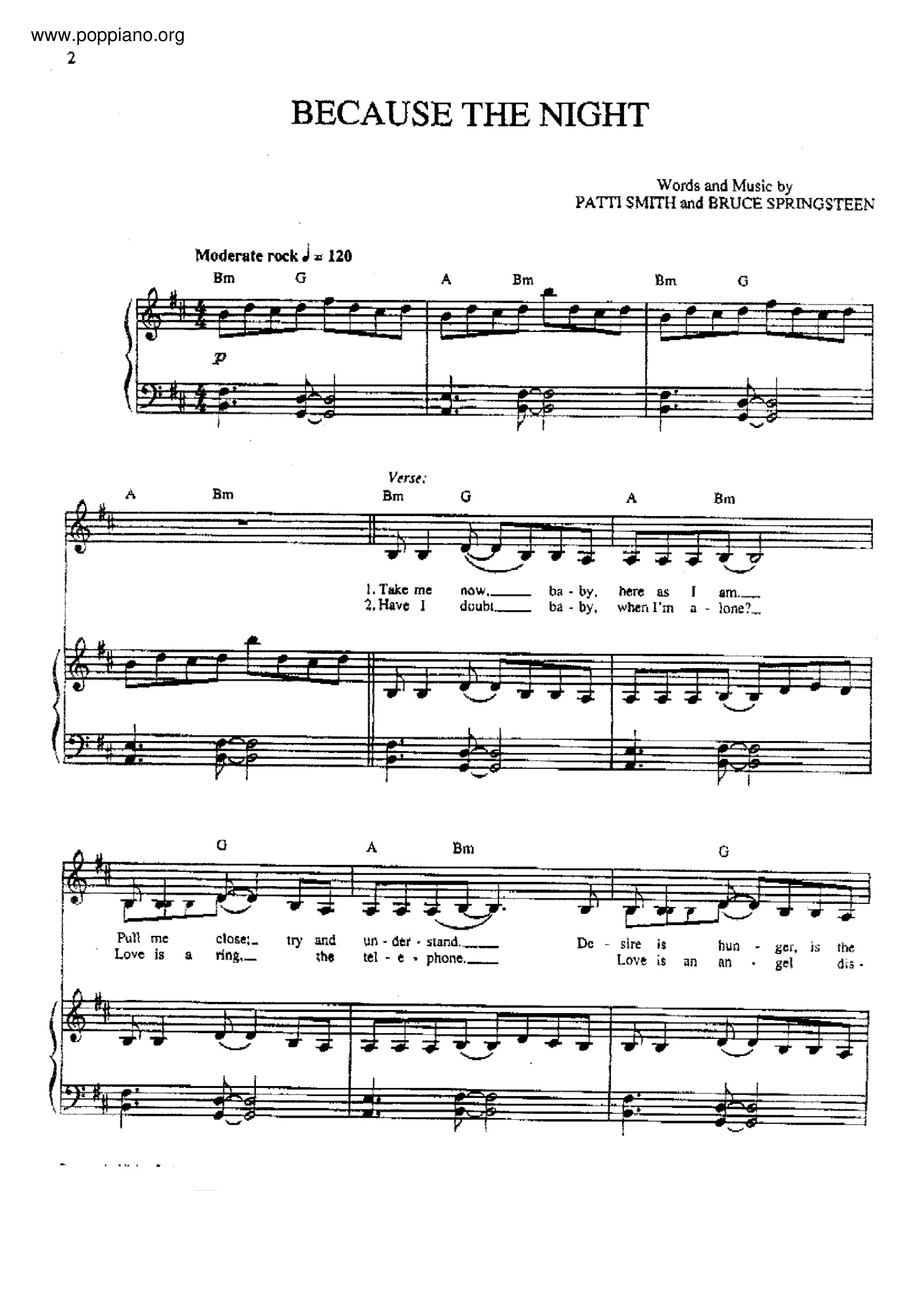 Because The Night Chords. There is no strumming pattern for this song yet. Create and get +5 IQ. Question/comments . . . ianvomsaal@yahoo.com 10,000 Maniacs -- Because The Night [Intro] Bm G A Bm x2 [Verse 1] Bm G A Bm Take me now, baby, here as I am. Bm G A Bm Hold me close try and understand.